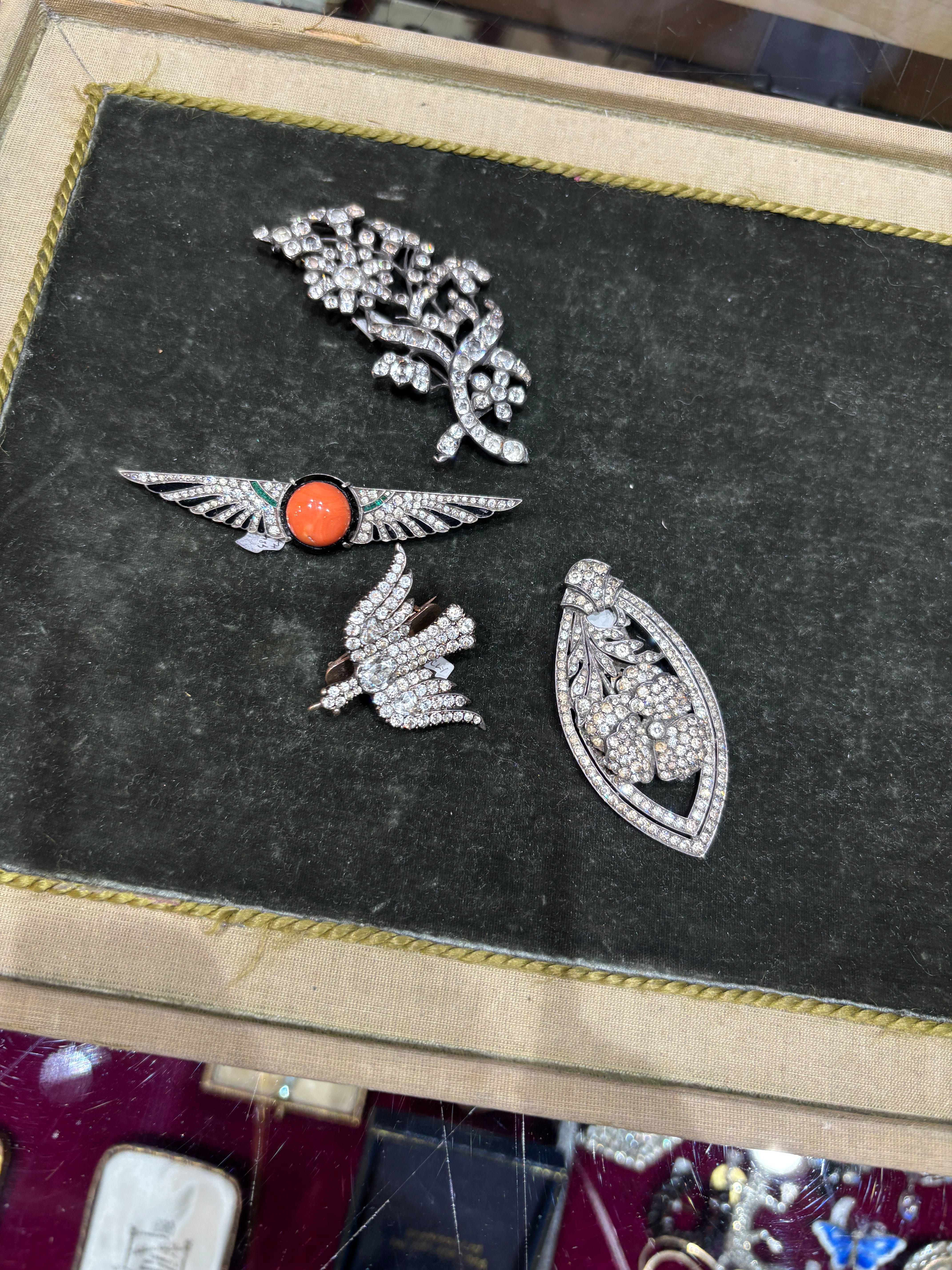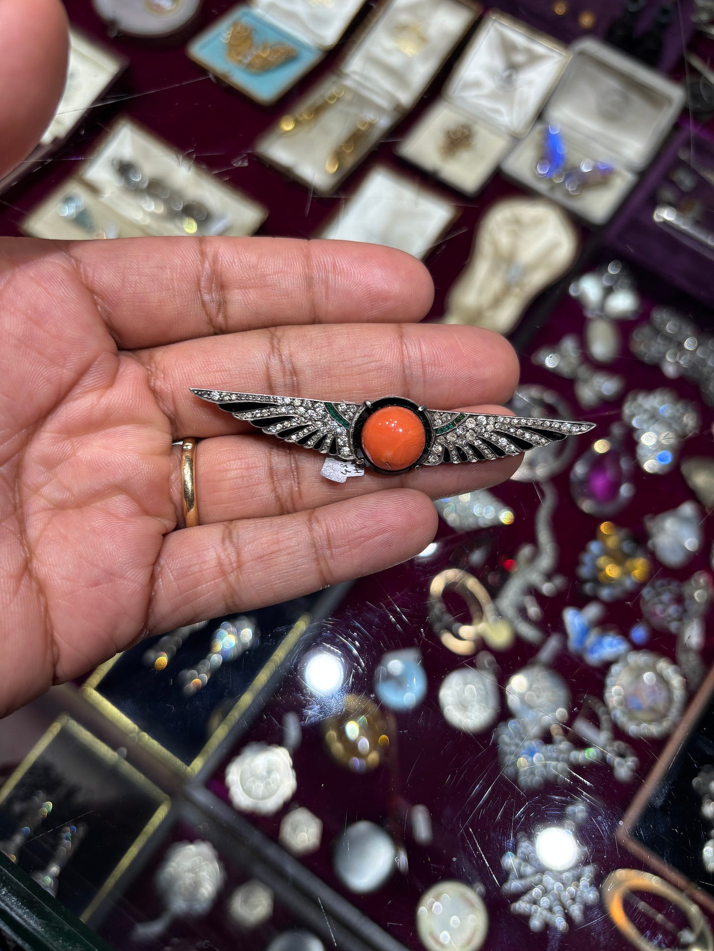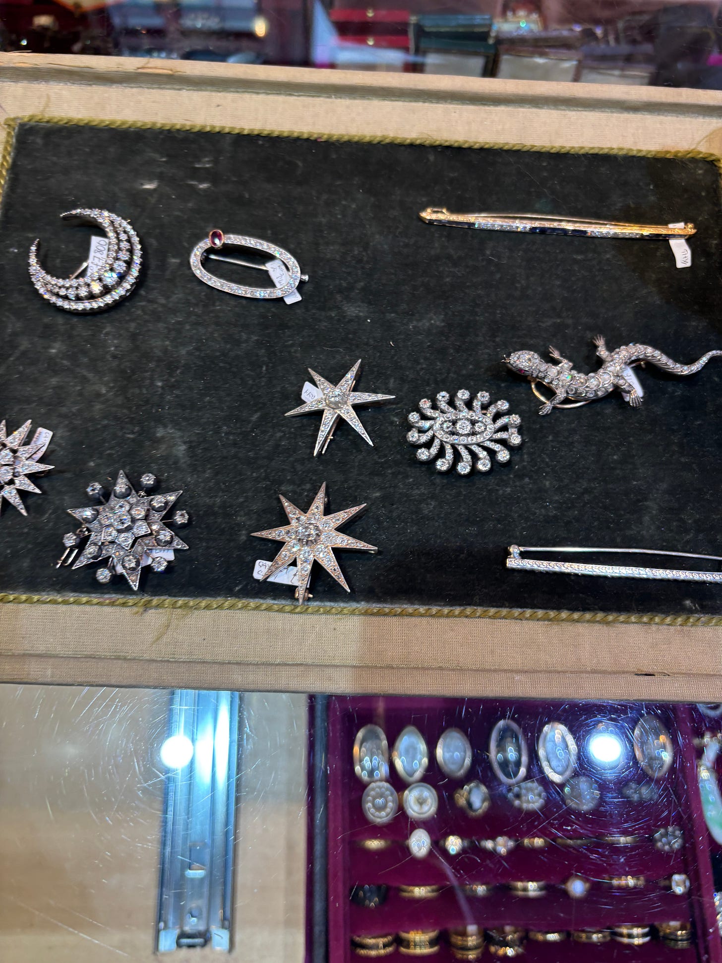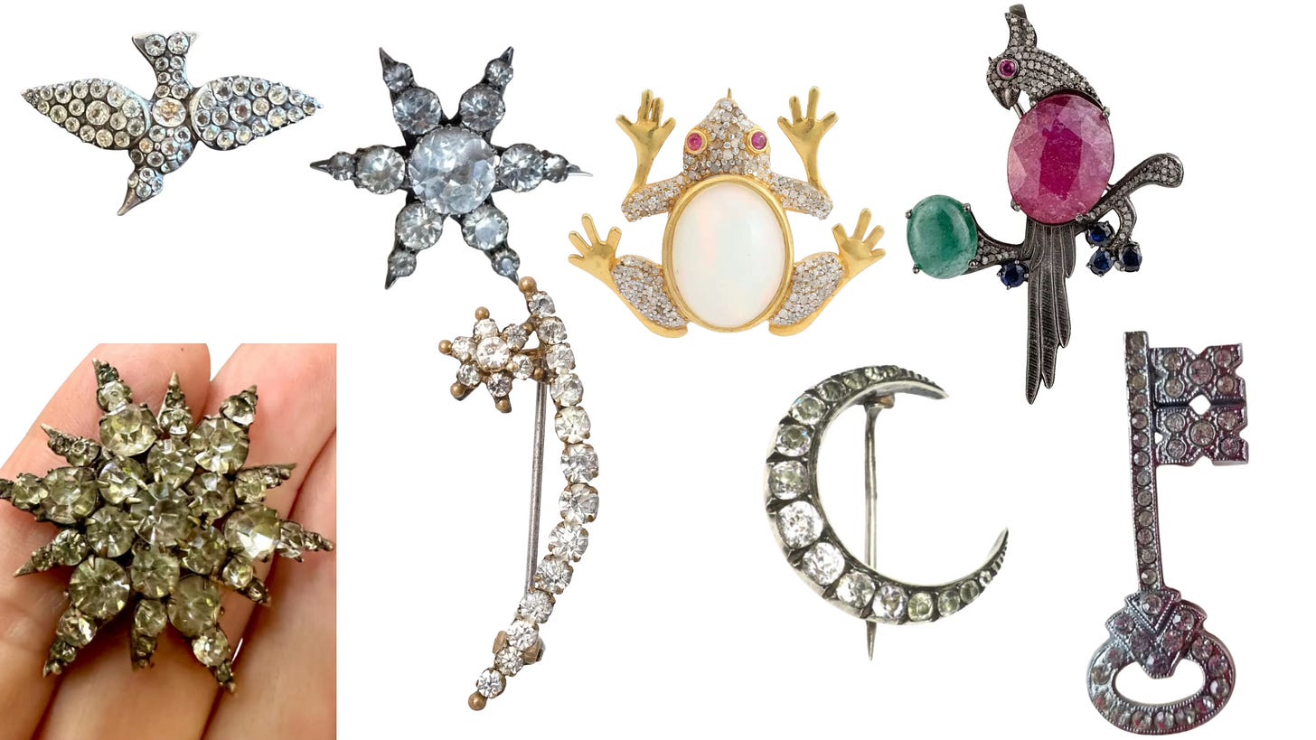After working on a piece for Only Natural Diamonds about Jackie O.’s jewelry, which truly felt like a dream assignment, I was inspired by the story of her purchasing an 18th-century diamond sunburst brooch in Wiltshire. I wanted my own little moment. I skipped Wiltshire though. As the story goes, Jackie had to sell off a few pieces to acquire that sunburst, and I’m not quite ready for that level of commitment. Instead, I went to Gray’s Antiques. I was on a bit of a time crunch, so I didn’t venture far. The first booth to the right of the entrance stopped me in my tracks with a row of paste brooches caught my eye.