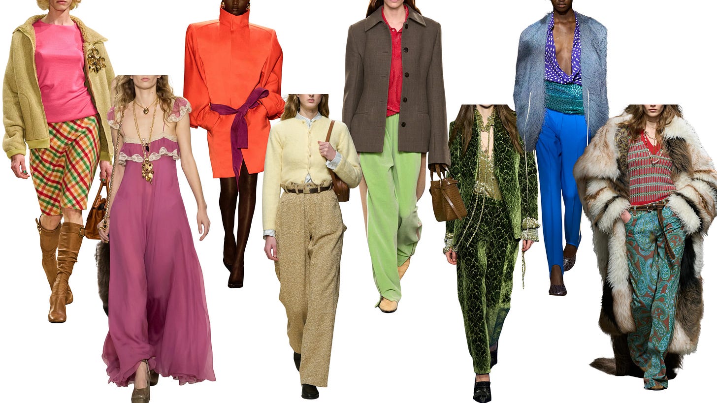 For the past few seasons, we’ve been awash in a sea of beige and neutrals, but something magical has been bubbling up both on and off the runway: COLOR! And not just the predictable pops of red that became second nature for so many brands, but rich, saturated shades of yellow, greens spanning from forest to astroturf, lush oranges, and beyond the bursts of color! And along with color there are prints galore, with everything ranging from animal, to retro-inflected, to your typical plaids and checks in iterations that feel fresh and exciting.